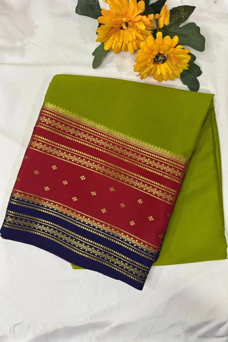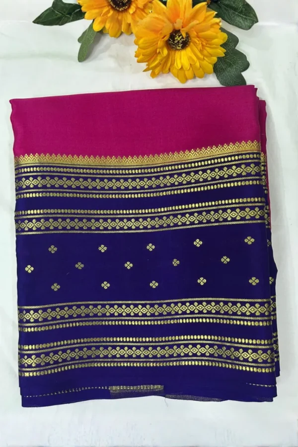 Crafted from pure Mysore crepe silk, this saree showcases the beauty of traditional weaving through its Bentex-style gold zari border and contrast dual-tone body. The soft crepe silk fabric offers a lustrous sheen, smooth texture, and graceful fall — making it comfortable yet luxurious.