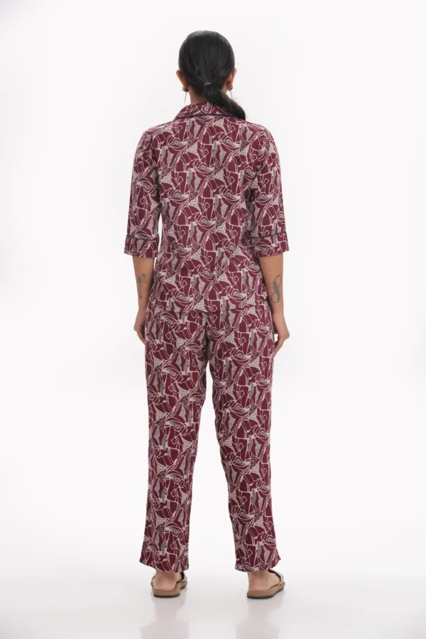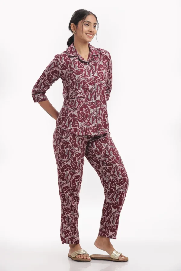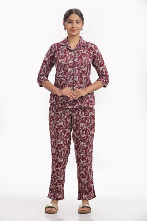 Unwind in style with this Crimson Leaf Print Nightwear Set, crafted from soft and lightweight Alphinr fabric that ensures maximum comfort for your evenings and nights. The deep maroon base with abstract white leaf motifs adds a touch of subtle elegance to your loungewear collection.