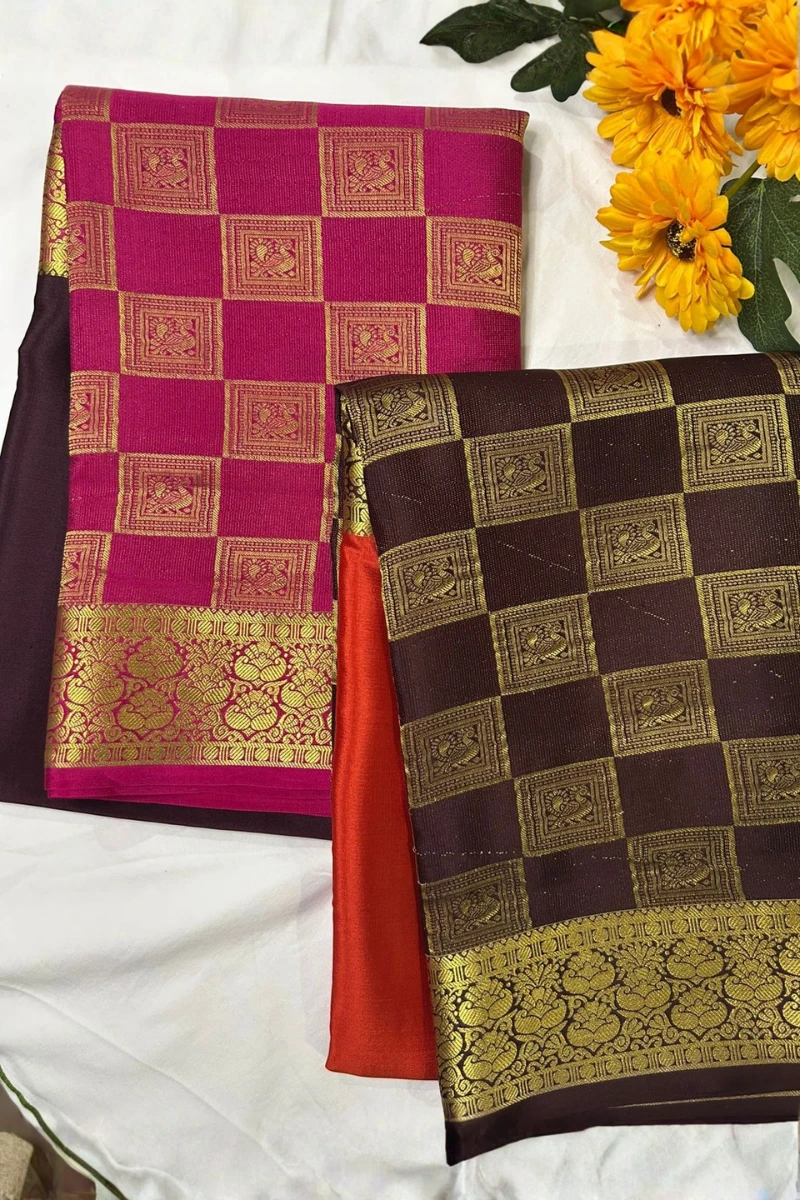 Crafted in premium silk with intricate golden zari checks and peacock motifs, this saree radiates traditional charm and luxury.